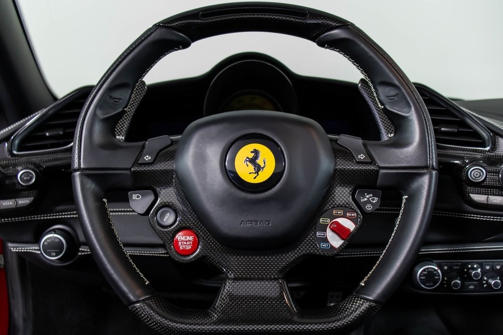 This 2017 Ferrari 488 Spider is finished in iconic Rosso Corsa over a sleek Nero interior, delivering a perfect blend of open-top exhilaration and Ferrari performance. Equipped with carbon fiber accents throughout the cabin including the driver zone with LED steering wheel, central bridge, upper tunnel trim, and dash inserts. It offers a focused, race-inspired driving environment. Yellow brake calipers, a yellow rev counter, and Cavallino stitching on the headrests add striking contrast, while the sport exhaust system enhances the unmistakable Ferrari sound. Additional highlights include full electric seats, premium hi-fi audio, parking camera with front and rear sensors, and 20" forged diamond wheels, making this 488 Spider an exceptional combination of style, technology, and thrilling performance.