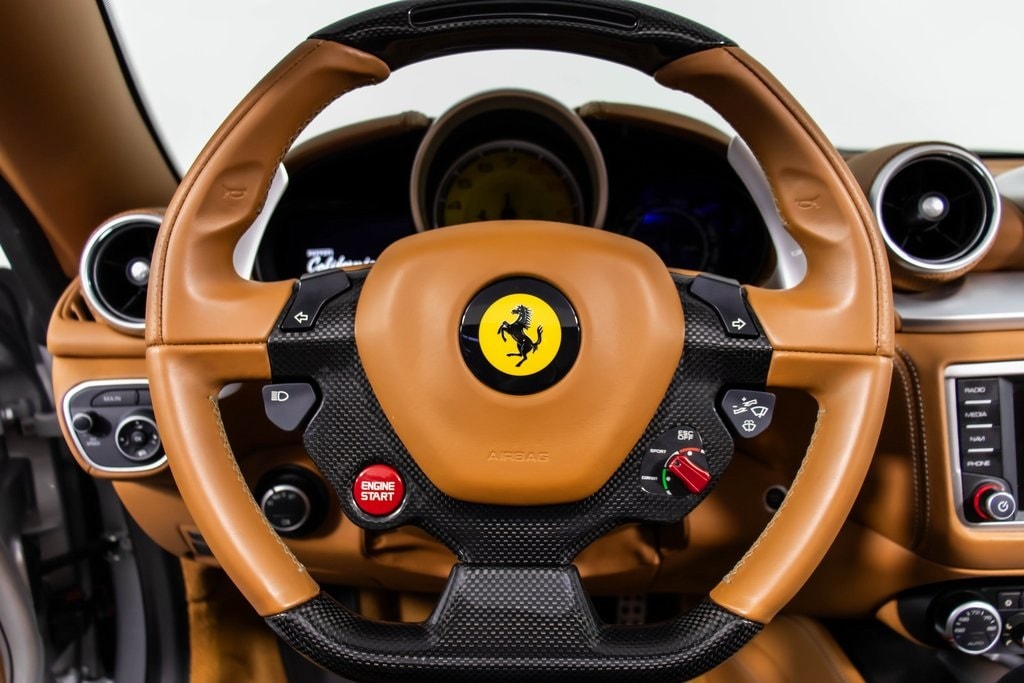 This stunning 2017 Ferrari California T is finished in sleek Argento Nurburgring Metallic, paired beautifully with a rich Cuoio leather interior and Nero mats, creating a timeless and refined look. Blending grand touring comfort with Ferrari performance, this California T features ventilated full electric seats, foldable rear seat backrests, and luxurious leather/Alcantara interior trim with a colored upper dashboard and special stitching for a bespoke touch. The Cavallino stitched on the headrests, colored seat belts, and custom piping further elevate its tailored design. Performance is complemented by yellow brake calipers, sport exhaust pipes, and 20 forged dark painted rims, ensuring both elegance and aggression. Inside, the carbon fiber steering wheel with LEDs, carbon fiber cup holder, and chromed front grille showcase Ferraris commitment to detail. Modern conveniences like a parking camera, rear CD reader, and tire pressure monitoring system make this California T the perfect balance of Italian craftsmanship, comfort, and open-top excitement.