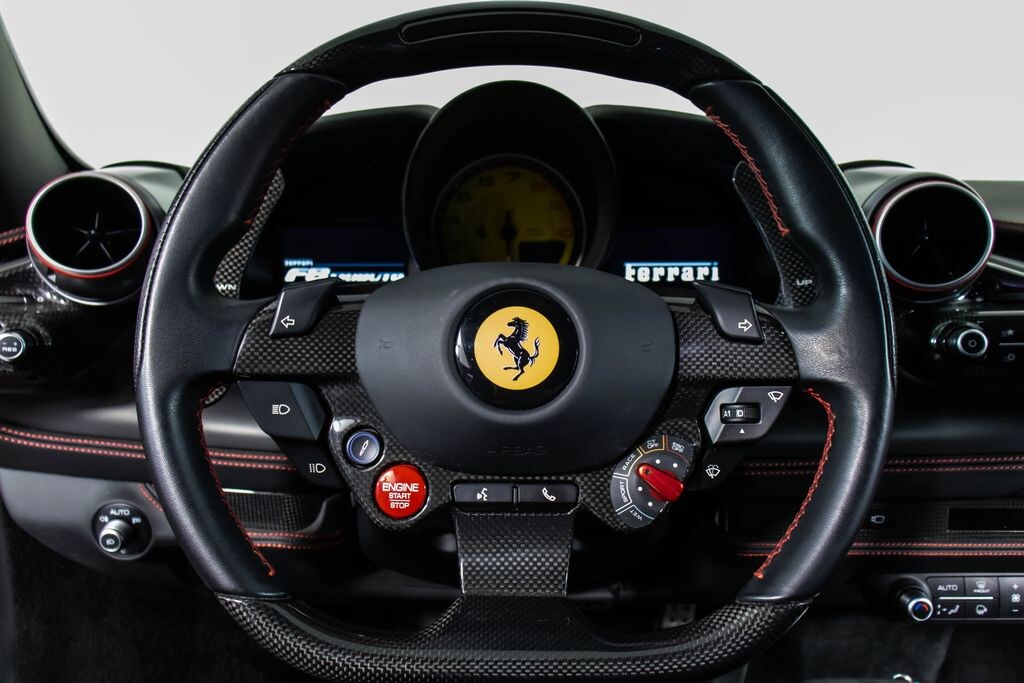 Finished in the legendary Rosso Corsa over a Nero interior, this 2020 Ferrari F8 Tributo is a striking expression of Ferraris mid-engine V8 excellence, combining aggressive styling with cutting-edge performance. The exterior is enhanced by glossy black brake calipers and 20-inch forged diamond wheels, while carbon fiber elementsincluding the side air splitters, inner door handles, driver zone with LED steering wheel, central bridge, and dashboard insertsemphasize its race-inspired DNA. Inside, the cabin features Rosso Ferrari accents, a yellow rev counter, red air vent grips, and a Rosso-stitched Cavallino on the headrests, all tied together with Rosso contrast stitching for a cohesive, performance-focused aesthetic. Equipped with adaptive front lighting, suspension lifter, advanced front driving camera, parking camera, and front and rear parking sensors, it offers both thrilling capability and everyday usability. Finished with Scuderia Ferrari shields, full electric seats, and a premium attention to detail, this F8 Tributo delivers an exhilarating driving experience with unmistakable Italian flair.