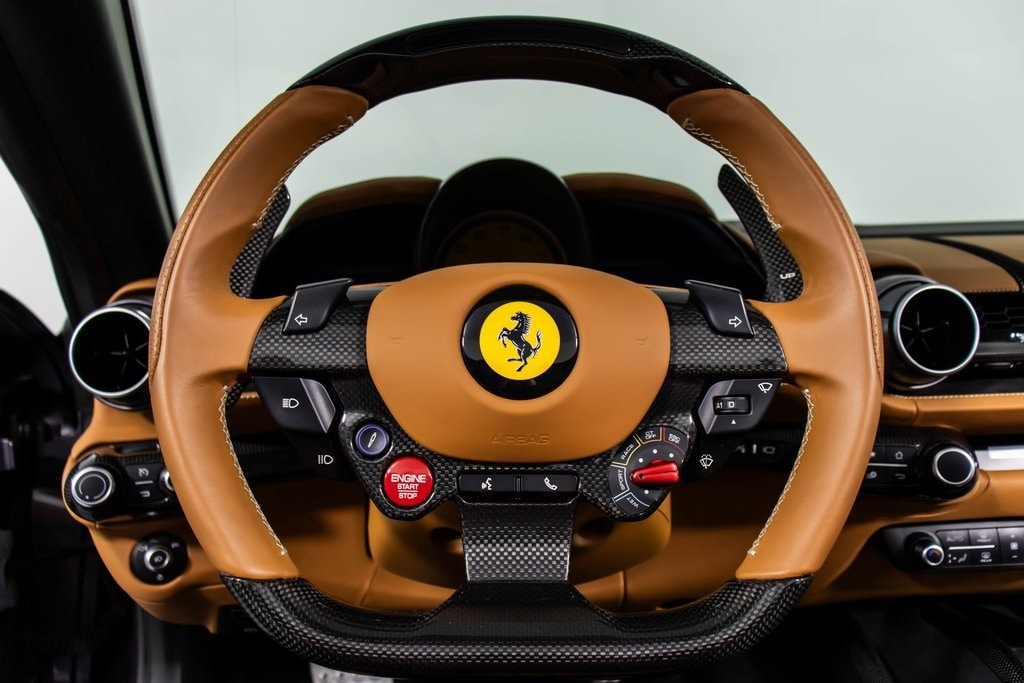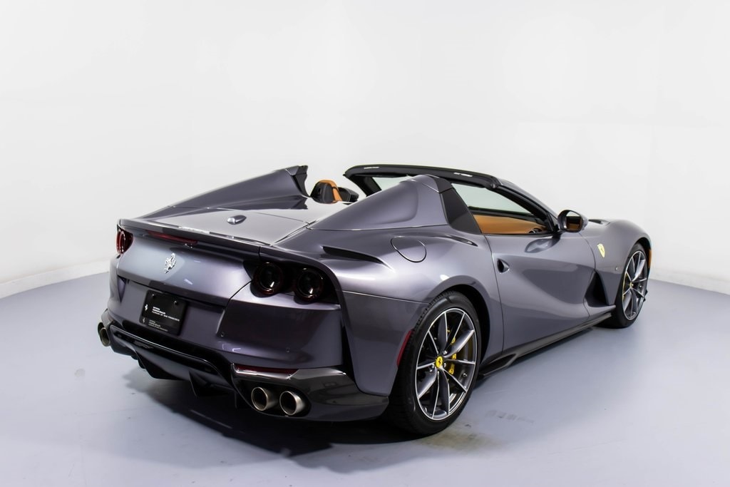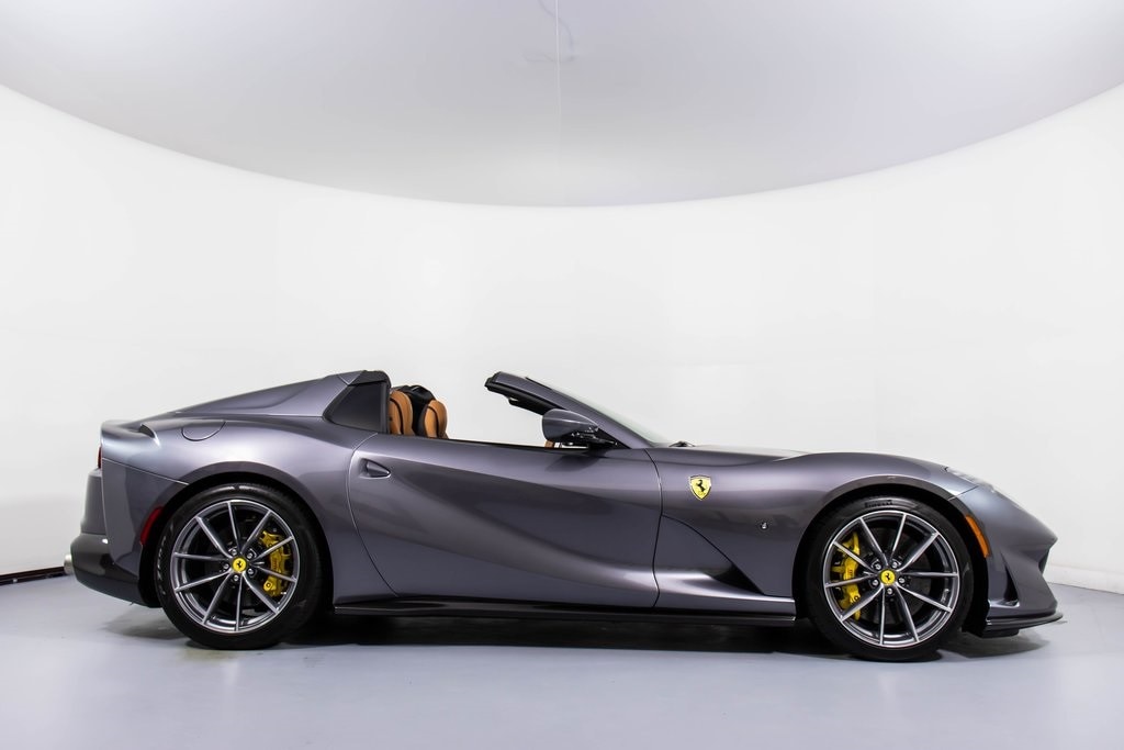 The 2022 Ferrari 812 GTS, finished in the elegant Grigio GTS exterior and featuring a sophisticated Cuoio interior with Nero carpets, exemplifies Ferrari's commitment to luxury and performance. This open-top masterpiece is equipped with a range of high-performance features, including carbon fiber components such as the front bumper, rear side bumpers, underdoor cover, driver zone, central bridge, exterior sill kick, and upper part of the center console, all enhancing its dynamic design and weight efficiency. The vehicle also boasts adaptive headlights with SBL function, yellow brake calipers, and 20" forged diamond wheels, adding to its aggressive yet refined aesthetic. Inside, the Daytona-style seats and Cavallino stitched on the headrests in Grigio Chiaro provide both comfort and a touch of elegance, while the colored special stitching in Grigio Chiaro and colored steering wheel in Cuoio create a cohesive and luxurious cabin. The suspension lifter and advanced front driving camera ensure superior handling, while the high-power hi-fi system and Apple CarPlay provide modern convenience and entertainment. This 812 GTS is a true blend of Ferrari's classic performance and cutting-edge design, offering a thrilling driving experience with uncompromising luxury.