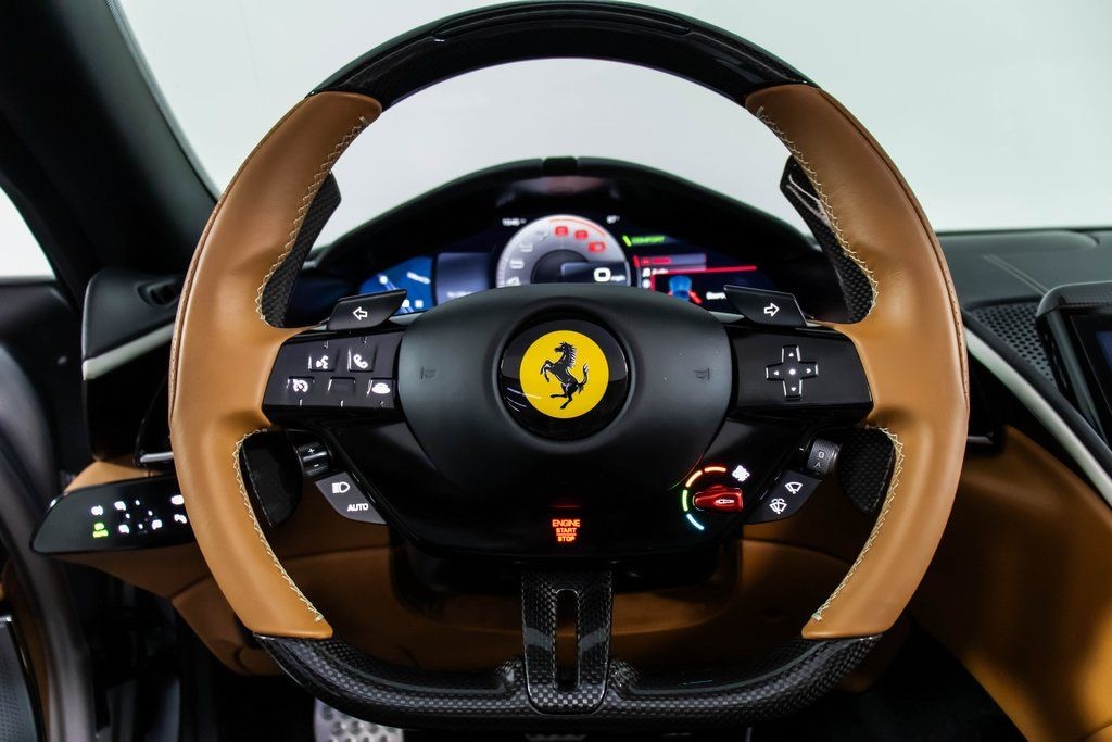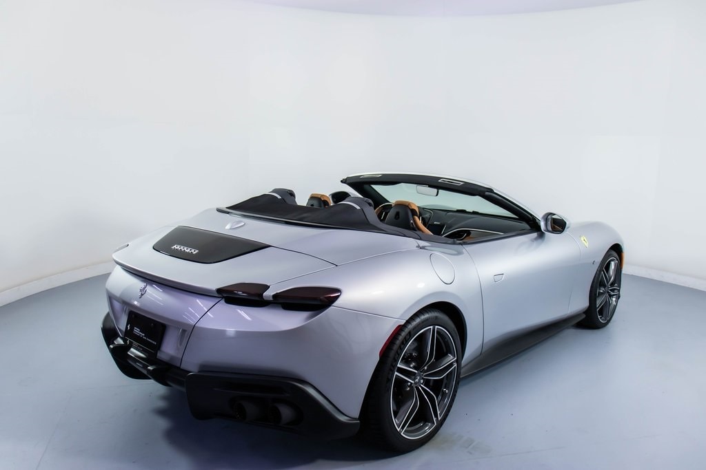 This 2025 Ferrari Roma Spider is a stunning blend of modern elegance and open-air performance, finished in classic Argento Nurburgring over a refined Cuoio leather interior with Nero mats. Its sophisticated design is enhanced by diamond-polished forged wheels, glossy black brake calipers, carbon fiber accents throughout the cabin, and a black tailoring fabric soft top, creating a timeless yet athletic presence. Inside, quilted ventilated full electric seats with Grigio Chiaro detailing, dual-color leather trim, and a Cuoio steering wheel deliver exceptional comfort and craftsmanship, while carbon fiber steering wheel with LEDs adds a motorsport-inspired touch. Equipped with Magneride dual-mode suspension, advanced front driving camera, back radar, and MyFerrari Connect, this Roma Spider offers confident performance and cutting-edge technology. Premium features such as a high-power Hi-Fi system, smartphone interface, wireless charging, and HomeLink ensure everyday usability, making this beautifully specified Roma Spider an exceptional expression of Ferraris luxury grand touring heritage.