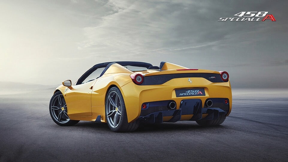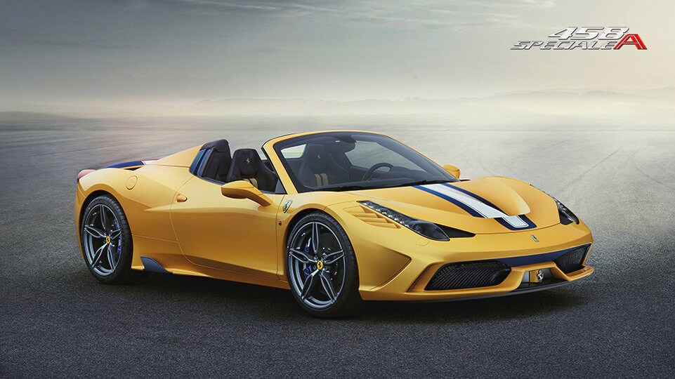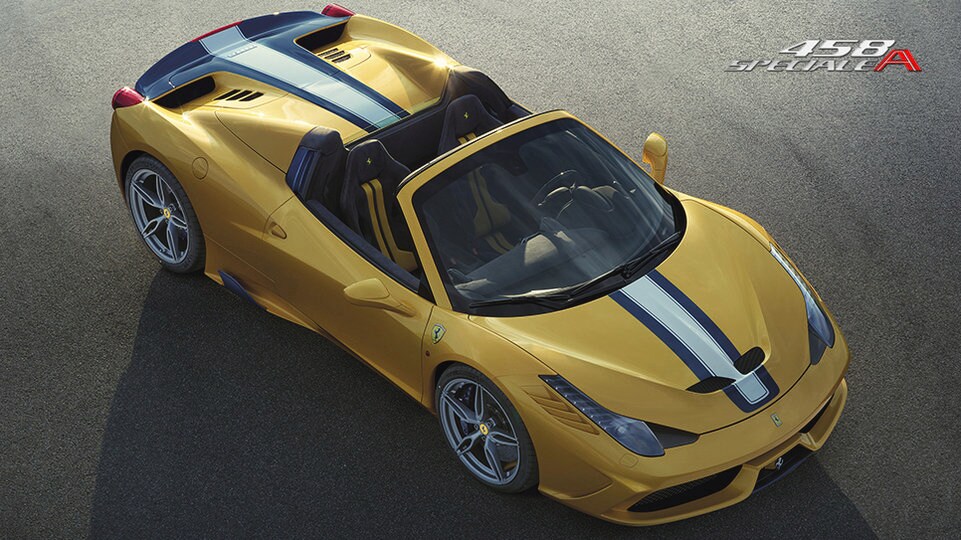 Ferrari is pleased to announce the Mondial de l'Automobile (Paris Motor Show) world debut of the 458 Speciale A (A as in Aperta). The new limited edition special series is a celebration of the dazzling success of the various versions of the 458, a model that has collected an array of international motoring media awards and track victories, not least a double WEC title and category wins in classic endurance races, such as the 24 Hours of Le Mans, the 24 Hours of Daytona and the 12 Hours of Sebring. Dedicated to just 499 Ferrari collectors, the 458 Speciale A is the most powerful spider in Prancing Horse history, effortlessly marrying extreme performance with the sublime pleasure of drop-top driving. Its aluminium retractable hard top, which takes a mere 14 seconds to deploy or retract, helps reduce the weight difference with the Speciale coupé to just 50 kg. The 458 Speciale A sports the most powerful naturally-aspirated road-going V8 engine ever built by Ferrari. It punches out a massive 605 cv (135 cv/l specific power output) and 540 Nm of torque at 6000 rpm yet only generates 275 g/km of CO2 emissions. The three international Best Performance Engine awards the V8 has won are acknowledged on a special plaque in the cockpit. The new car sprints from 0-100 km/h in just 3.0 seconds and has a Fiorano lap time of 1'23"5. These superb results are thanks in great part to its front and rear active aerodynamics, the rigidity of a chassis that incorporates 10 aluminium alloys, and Side Slip Angle Control (SSC) which guarantees unparalleled sporty driving in all conditions, underscored by the seductively exhilarating signature Ferrari soundtrack. As is the case with all Prancing Horse cars, the 458 Speciale A's sculpted forms are absolutely performance-oriented. In fact, a series of innovative and original bodywork solutions has made the 458 Speciale A the most aerodynamically efficient Ferrari spider ever. The 458 Speciale A is being premiered in a unique triple-layer yellow livery with a Blu Nart and Bianco Avus central stripe as well as five-spoke forged wheels in Grigio Corsa. The cockpit has a distinctive racing-inspired look: lightweight yet exclusive materials have been adopted throughout and, of course, crafted with Ferrari's signature artisanal sophistication. This is particularly true of the finish of the dash, the moulded door panels and central tunnel in an exclusive blue carbon-fibre (also used for the treadplates) as well as the newly-designed seats in Alcantara© with contrasting stitching and 3D technical fabric. TECHNICAL SPECIFICATION SUMMARY Engine **with HELE system | ![]() ![]() ![]() ![]() |