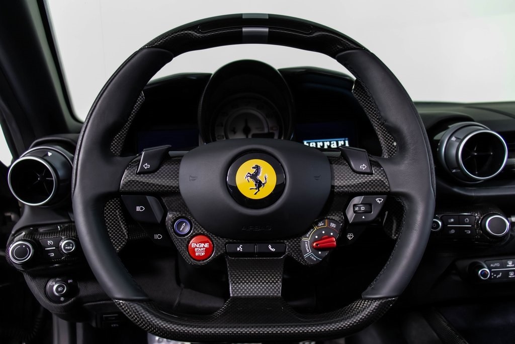 The 2024 Ferrari 812 Competizione A in Grigio Scuro Mic is a breathtaking expression of open-top V12 performance, elevated by an extensive list of carbon-fiber enhancements and Atelier-level personalization. Its aggressive exterior is sharpened by a carbon-fiber hardtop, front air intakes, rear diffuser, underdoor covers, wheel cups, instrument cover, and rear shelf, all underscoring the cars racing pedigree. The Nero interior continues the lightweight theme with Alcantara carpeting, carbon-fiber door handles, and carbon-fiber dashboard inserts, while the checked racing seatscomplete with a Cavallino stitched in Grigio Scurodeliver a purposeful, motorsport-inspired cabin feel. Comfort meets performance with a front lift, front and rear parking cameras, Apple CarPlay, and a High Power Hi-Fi system. The exteriors airbrushed Scuderia shields, special 2-layer paint, and 20" forged diamond racing wheels add exclusivity, while custom specifications, colored passenger compartment details, and precise O.R. stitching complete this meticulously crafted one-off inspired masterpiece.